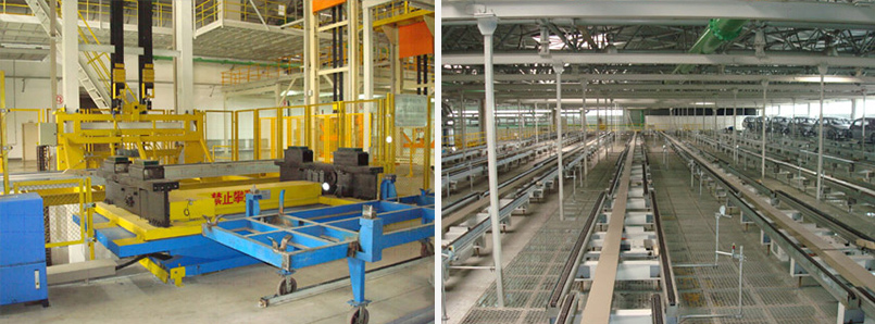 白車身從原來(lái)的升降段提升到系統(tǒng)上線處,接車后輸送到焊裝空中存儲(chǔ)線,在由存儲(chǔ)線輸送到涂裝車間,白車身在上線升降段提到到位,M1、M2車在地面通過(guò)從焊裝到涂裝的儲(chǔ)存線的升降段進(jìn)入焊裝至涂裝儲(chǔ)存線的全部工位,包括鏈?zhǔn)綕L床、升降段等。在車身經(jīng)升降段進(jìn)入空中儲(chǔ)存線的結(jié)構(gòu)平臺(tái)后,設(shè)置打號(hào)機(jī)操作區(qū),滾床儲(chǔ)存線和打號(hào)機(jī)具有通信和連鎖功能。該設(shè)備的生產(chǎn)節(jié)拍為110s/臺(tái),A1車焊裝空中儲(chǔ)存區(qū)設(shè)計(jì)的白車身儲(chǔ)存量為100臺(tái)。白車身從焊裝車間進(jìn)入涂裝車間的方式為過(guò)廊,在過(guò)廊設(shè)置三條滾床輸送線,過(guò)廊兩端設(shè)置帶式升降機(jī)。A1車身焊裝儲(chǔ)存線設(shè)車身自動(dòng)分類編組功能,焊裝至涂裝的三條輸送線,分別對(duì)應(yīng)A1、M1、M2車身的自動(dòng)分組輸送功能。A1車身焊裝儲(chǔ)存線和焊裝至涂裝儲(chǔ)存線中包含橫移機(jī)和旋轉(zhuǎn)臺(tái),并在附近設(shè)一操作臺(tái),便于手動(dòng)和自動(dòng)的切換。電氣控制系統(tǒng)采用PLC、總線控制方式,控制系統(tǒng)配置人機(jī)界面的觸摸屏,實(shí)現(xiàn)人機(jī)交流。
