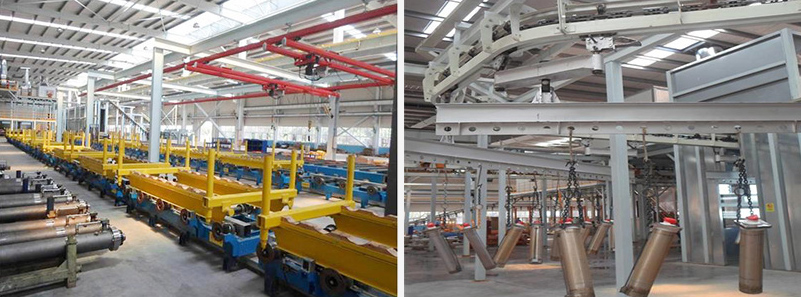 綜合油缸涂裝生產(chǎn)線采用XT160懸掛輸送機輸送工件,輸送速度在0.5-3m/min內(nèi)可調(diào),工作速度1.6m/min;變幅油缸涂裝生產(chǎn)線采用積放式懸掛輸送機,工件上下件出設(shè)有液壓升降臺配合工件上下輸送設(shè)備;伸縮油缸涂裝生產(chǎn)線采用地面小車輸送工件,地面小車采用四套垂直地面鏈輸送裝置輸送工件。