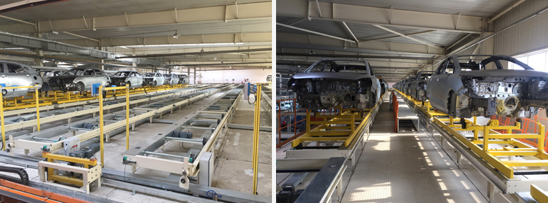 晉中吉利焊裝滑撬輸送線包括:包括焊裝至涂裝工廠帶式滾床輸送設(shè)備(WBS)、焊裝調(diào)整線(板式輸送鏈)等。主要設(shè)備有升降機(jī)、堆垛拆垛、叉式移載等。輸送線配置有CS控制系統(tǒng),AVI信息系統(tǒng),實(shí)現(xiàn)實(shí)時(shí)監(jiān)控現(xiàn)場(chǎng)設(shè)備、車身調(diào)度、故障報(bào)警等功能。