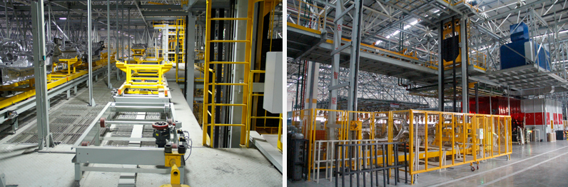 江鈴控股焊裝輸送線包括:包括焊裝至涂裝工廠滾床輸送設(shè)備(WBS)、 下車體線轉(zhuǎn)主線暫存輸送、主線轉(zhuǎn)調(diào)整線輸送、車身調(diào)整線等。主要機(jī)械設(shè)備有升降機(jī)、堆垛拆垛、叉式移載、輸送設(shè)備二樓鋼平臺(tái)及吊掛鋼平臺(tái)等。輸送線配置有CS控制系統(tǒng),AVI信息系統(tǒng),實(shí)時(shí)監(jiān)控系統(tǒng)、車身調(diào)度、故障報(bào)警等功能。完成白車身的輸送、轉(zhuǎn)接、儲(chǔ)存和排序等功能。
